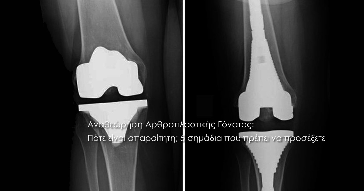 Η αναβολή μιας αναθεώρησης μπορεί να οδηγήσει σε μεγαλύτερη απώλεια οστού, κάνοντας τη δεύτερη επέμβαση πολύ πιο δύσκολη. Ο εξειδικευμένος ορθοπαιδικός θα χρησιμοποιήσει ακτινογραφίες, σπινθηρογράφημα ή ειδικές εξετάσεις αίματος για να επιβεβαιώσει την αιτία του προβλήματος. Αν αναγνωρίζετε κάποιο από τα παραπάνω συμπτώματα, δεν σημαίνει απαραίτητα ότι θα καταλήξετε στο χειρουργείο, αλλά ότι απαιτείται άμεση αξιολόγηση.