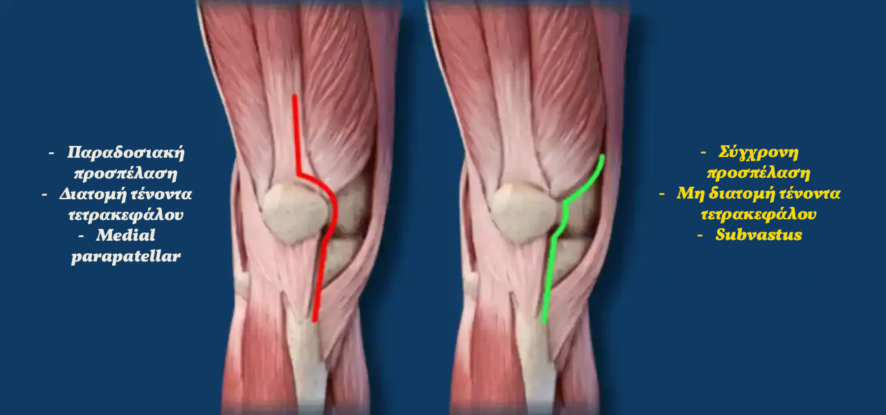 Η κύρια διαφορά είναι ότι με αυτή την προσπέλαση δεν γίνεται τομή του τένοντα του τετρακέφαλου. Ο χειρουργός προσεγγίζει την άρθρωση του γόνατος πηγαίνοντας κάτω από τον τετρακέφαλο μυ, διατηρώντας τη δομή του μυός και του τένοντα. Αυτό οδηγεί σε λιγότερο πόνο, καλύτερη σταθερότητα και ταχύτερη ανάρρωση.